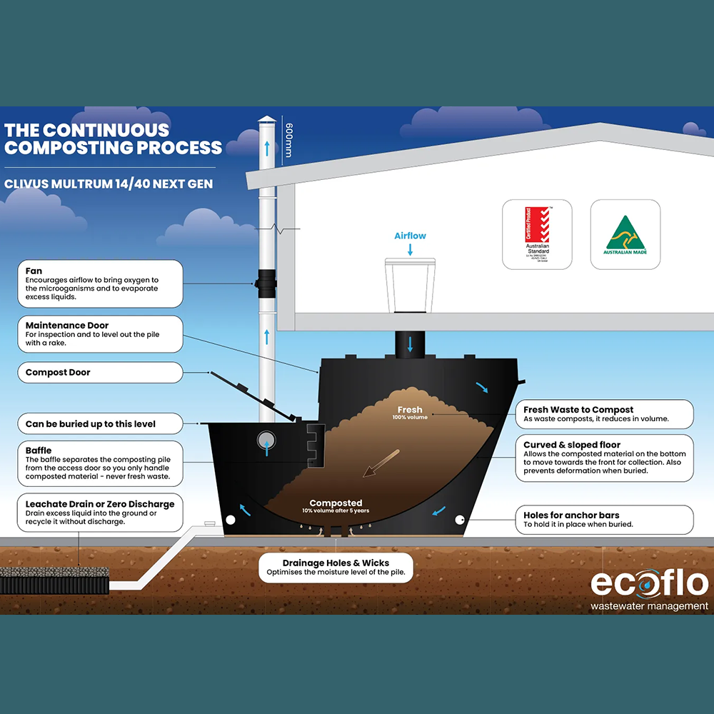 Proudly Australian-designed and owned, this high-capacity system is ideal for commercial use, large households, and public facilities, ensuring efficient, eco-friendly waste management for up to 19 part-time users.