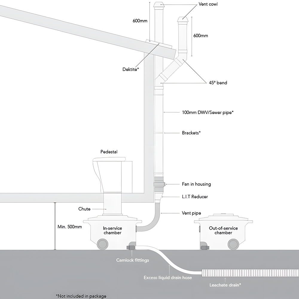 Ideal for medium-sized households, cabins, and off-grid living, this system features larger capacity chambers and a split system design, positioning the compost chamber under the floor and connecting to the pedestal via a waste chute.