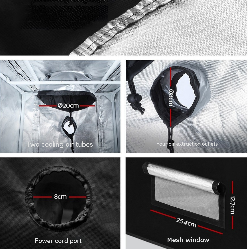 With a cooling air tube, extraction openings, ventilation windows, and two power cord ports, the tent is set up to suit basic airflow and cable routing. This helps keep the grow area organised once the equipment is installed.